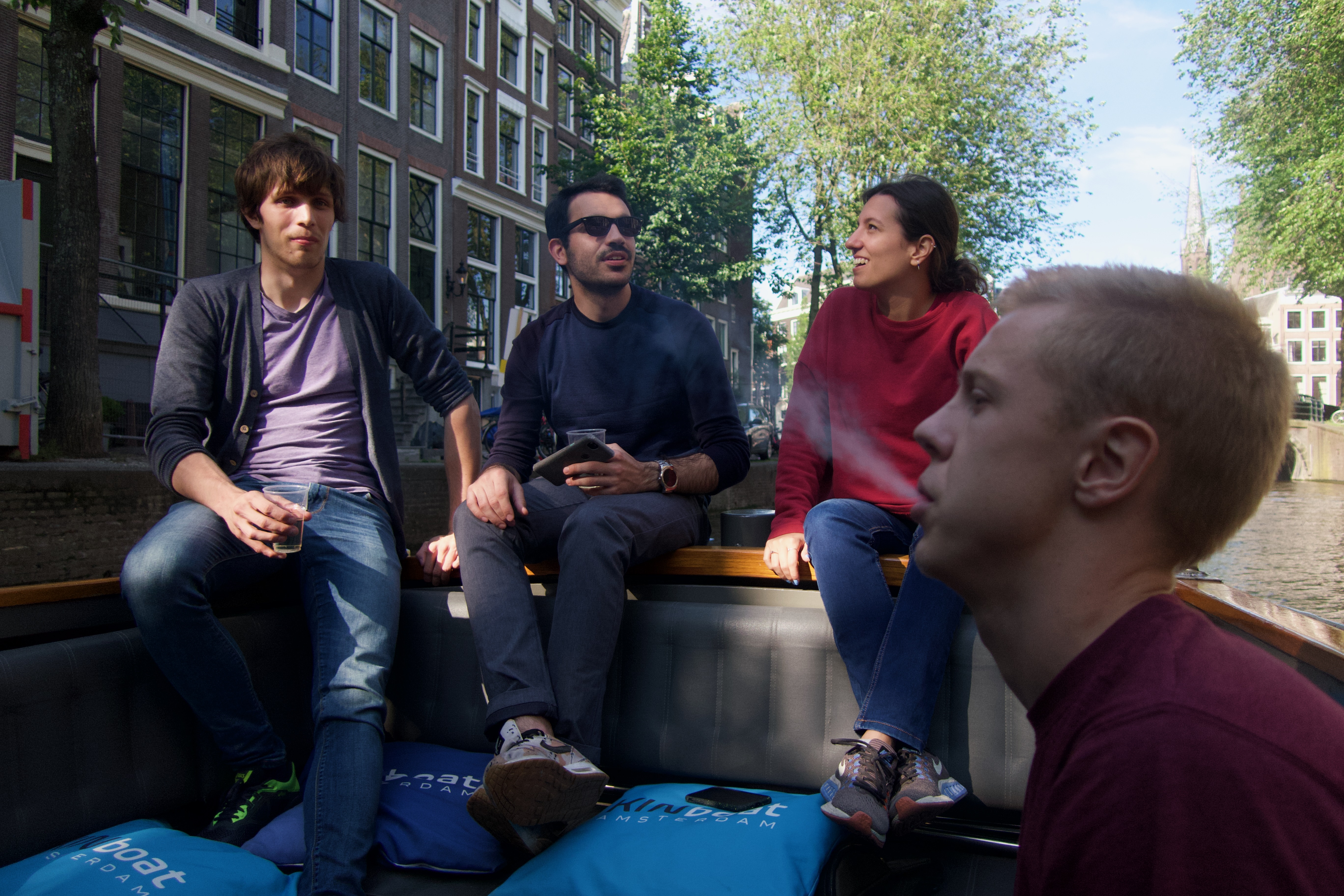 In a sunlit canal boat, four friends share a relaxed moment, their expressions reflecting a blend of laughter and contemplation. The composition captures a candid interplay between light and shadow, accented by the lush greenery along the canal's edge. The mood is warm and connected, embodying a joyful escape in a vibrant urban setting.