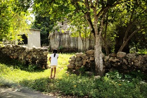 A young girl walks barefoot on a sunlit path, framed by lush greenery and a rustic stone wall. The atmosphere is serene and nostalgic, evoking a sense of childhood exploration and wonder. Soft light filters through the trees, casting gentle shadows that enhance the natural beauty of the rural setting.