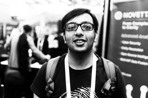 In a bustling environment, a young man stands at the forefront, smiling warmly while surrounded by a blur of people and booths behind him. The black and white tones create a classic feel, emphasizing his expression of joy and connection in the moment. The soft lighting highlights his features, drawing the viewer's attention to his friendly demeanor amidst the vivid activity of the event.