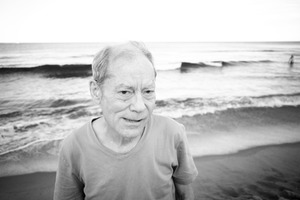 The photograph captures an older man standing on a beach, framed against the gentle waves of the ocean. Rendered in striking black and white, the soft light creates a serene mood, highlighting the man's contemplative expression as he gazes slightly off-camera. The composition balances the subject with the expansive horizon, evoking a sense of tranquility and nostalgia.