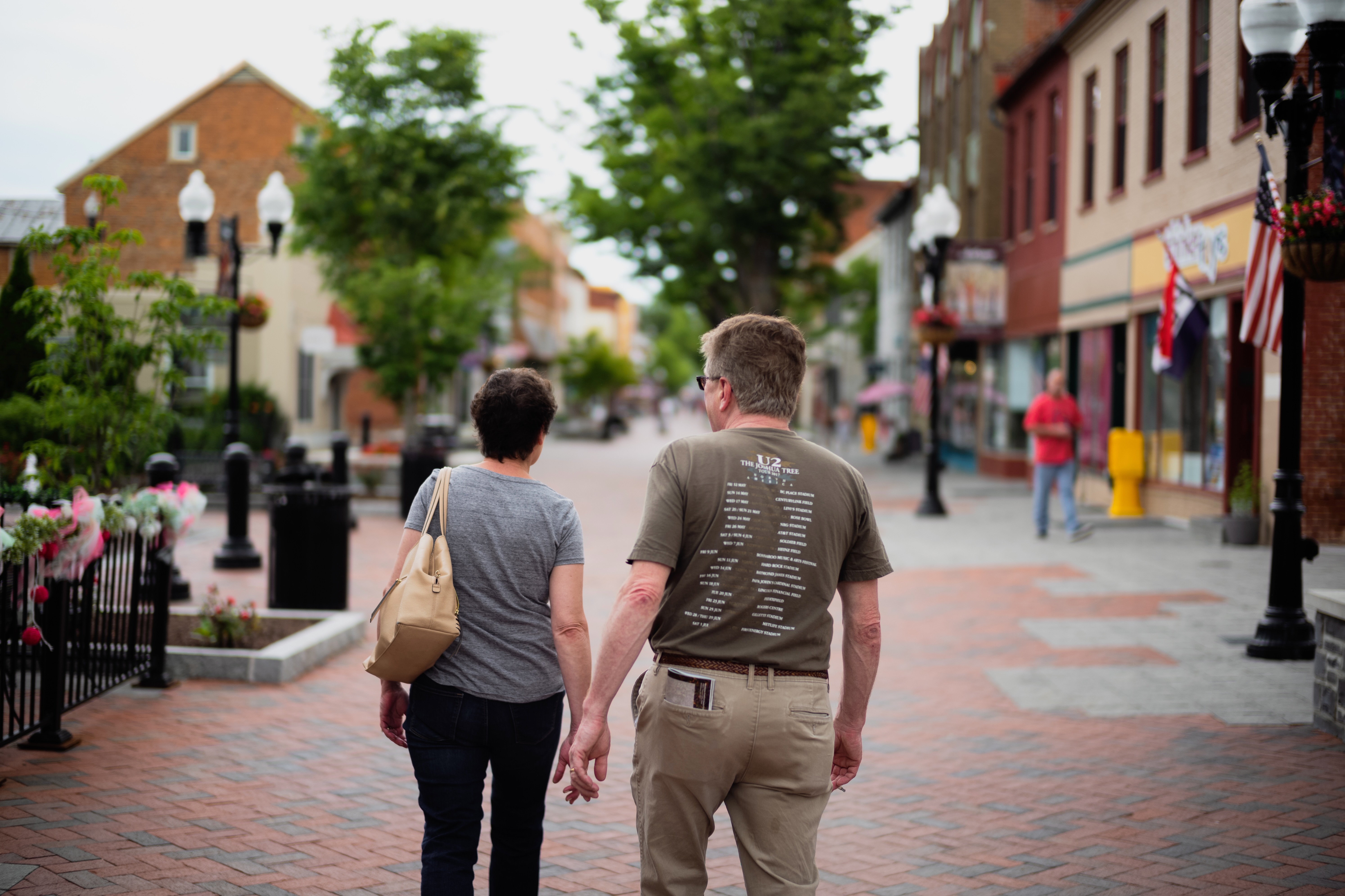 This photograph captures a couple walking hand in hand down a quaint, tree-lined street, radiating intimacy and companionship. The soft natural light enhances the warm, inviting atmosphere, while the charming storefronts create a backdrop that evokes a sense of nostalgia and tranquility. The composition draws the viewer’s eye along the path, inviting them into a moment of shared connection and everyday joy.