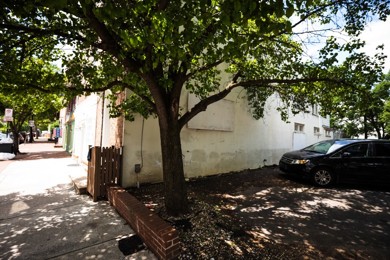 A leafy tree casts dappled shadows on a quiet sidewalk leading to a faded, unadorned wall, evoking a sense of serenity amidst the city bustle. Sunlight filters gently through the foliage, highlighting the subtle textures of the environment. The composition balances natural and urban elements, inviting viewers to pause and reflect in this tranquil corner.
