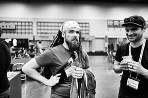In a candid moment captured in black and white, two men engage in light-hearted conversation at a bustling event. The lighting casts soft shadows, enhancing the texture of their expressions and attire, evoking a sense of camaraderie and relaxed familiarity in a dynamic environment.