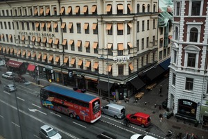 This photograph captures a bustling city scene, framed by the intricately designed façades of buildings. The vibrant double-decker bus adds a splash of color, while the muted tones of the architecture and cloudy sky evoke a somber yet lively mood. The composition, with its layered elements of street activity and architectural details, invites the viewer to explore the urban landscape.