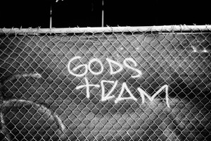 Bold white letters declare 'GODS TEAM' against a textured, dark background, creating a striking contrast that draws the eye. The gritty chain-link fence adds an urban edge, while the monochrome palette evokes a sense of seriousness and contemplation. This creates a mood that feels both rebellious and spiritual, inviting reflection on the message's deeper meanings.
