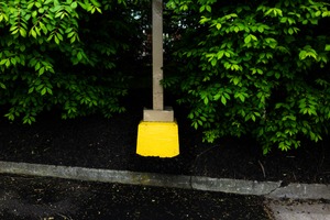 The photograph captures a striking contrast between a stark, yellow base of a pole and lush green foliage surrounding it. The vibrant color accentuates the somber, shaded atmosphere, creating a sense of isolation amidst the abundance of nature. The composition emphasizes the lone pole, suggesting themes of industrial intrusion in a natural landscape.