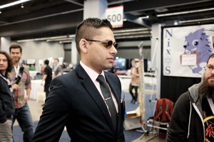 In this candid moment, a sharply dressed man in sunglasses stands confidently, exuding an air of sophistication amidst a bustling convention backdrop. The contrast between his sleek suit and the casual attire of those around him creates a striking visual tension, while the soft lighting highlights his thoughtful expression. The composition draws the viewer's eye to his poised demeanor, suggesting a narrative of individuality in a collective setting.