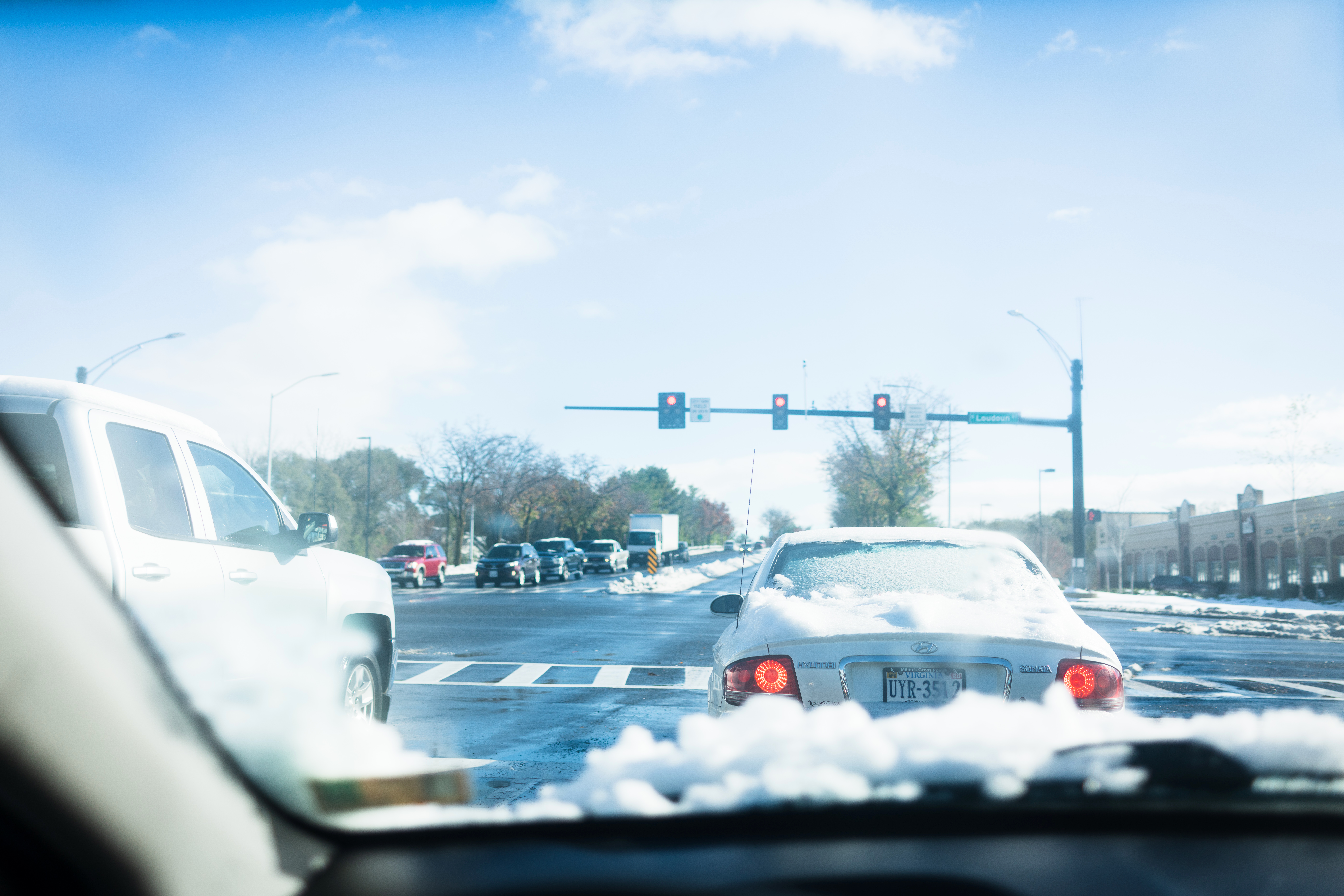 The photograph captures a view through a car windshield, showcasing a line of vehicles halted at a traffic light amidst a light dusting of snow. The bright daylight illuminates the scene, contrasting the white snow against the dark asphalt, evoking a sense of calm and stillness typical of winter mornings. The hazy focus and soft tones in the foreground add a dreamy quality, inviting contemplation in an otherwise busy scene.