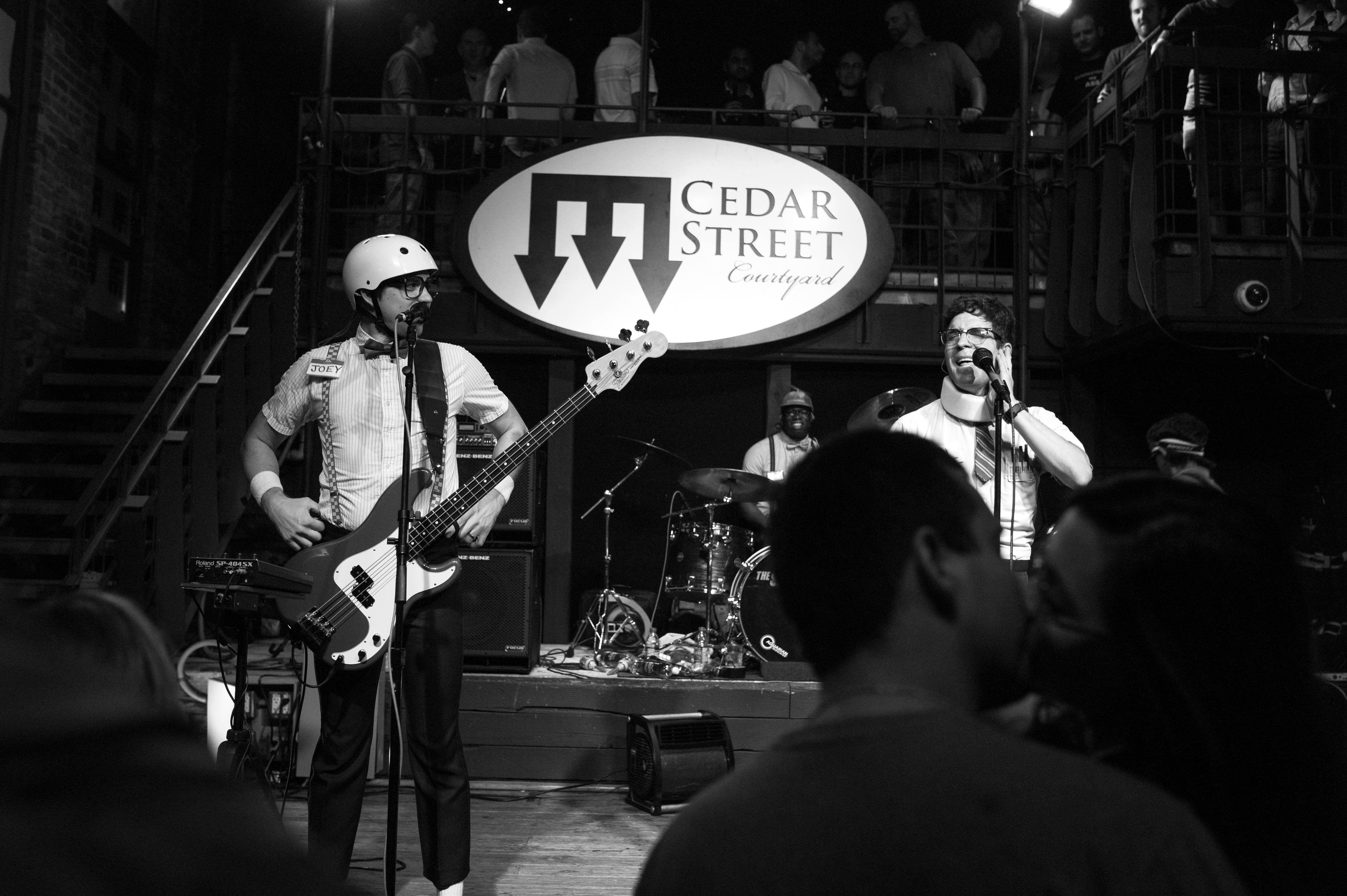 In a lively venue, two musicians capture the spotlight, their vibrant energy contrasting with the deep shadows surrounding them. The monochrome palette enhances the intimacy of the moment, while the audience, partially visible in the foreground, leans in, absorbed by the performance. Ambient stage lighting creates a dynamic atmosphere, making the scene pulse with the beat of the music.