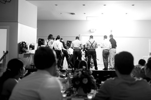 A lively scene unfolds as a group of men, wearing smart attire with suspenders, dance energetically on stage, creating a vibrant focal point in a dimly lit reception room. The composition captures the excitement of the celebration, with guests seated at tables, their expressions ranging from delight to curiosity, framed in soft focus. The high contrast lighting draws attention to the performers while lending a nostalgic, emotional quality to the monochromatic atmosphere.