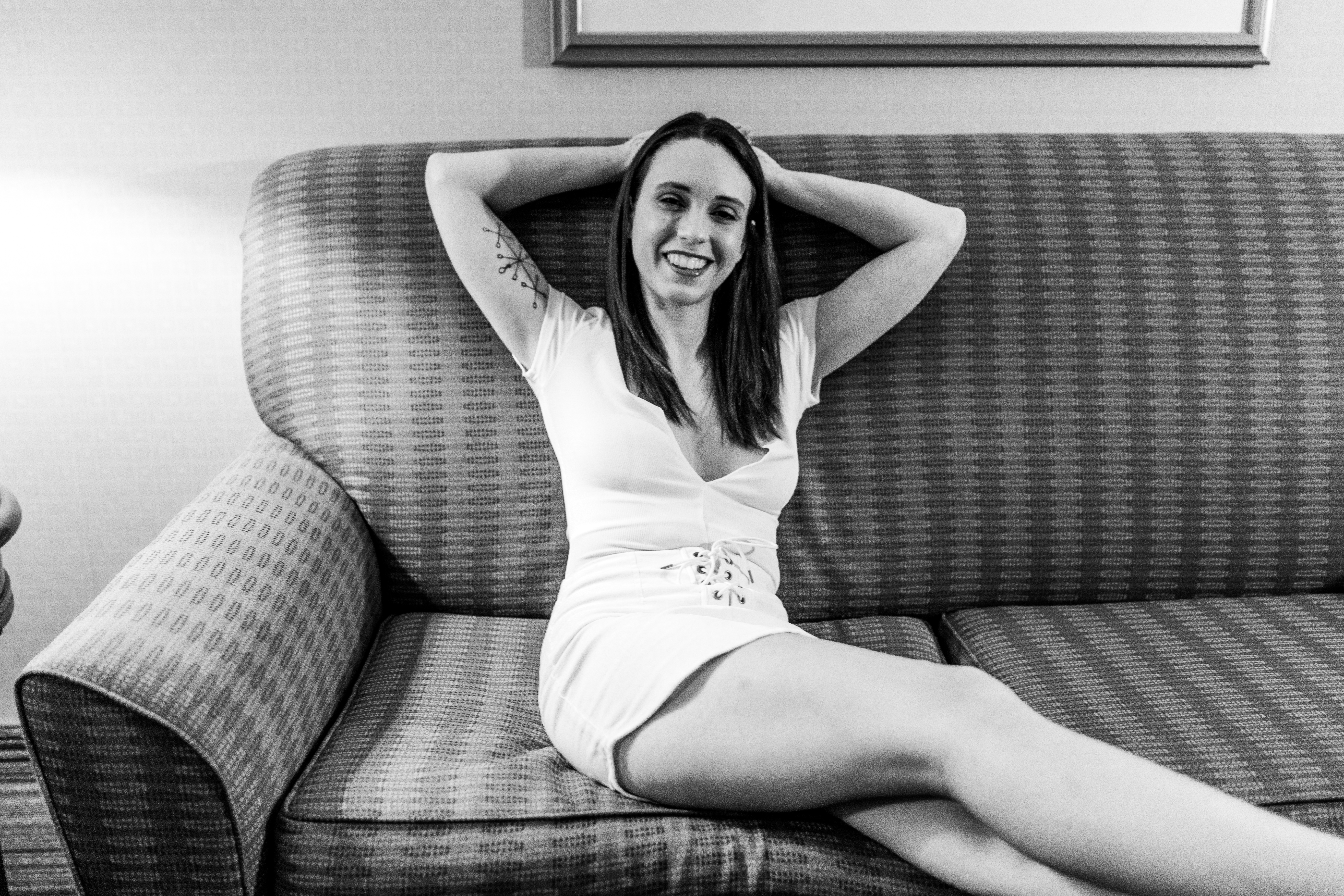 In this monochromatic photograph, a young woman lounges comfortably on a patterned couch, her posture exuding confidence and ease. The soft light highlights her features, creating a warm and inviting atmosphere while enhancing the playful yet sophisticated mood. Her smile, paired with a stylish outfit, captures a moment of relaxed charm reminiscent of carefree days.