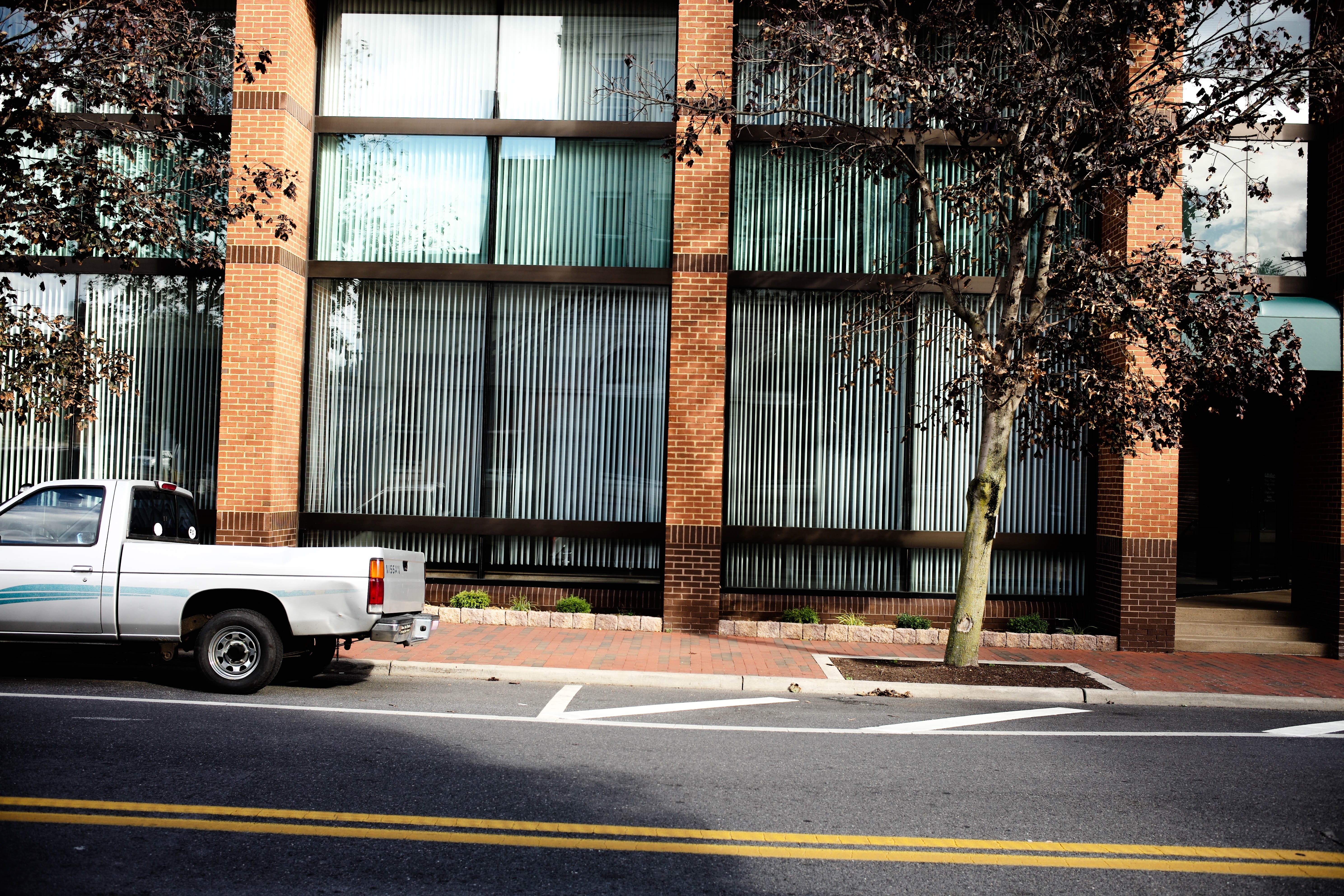 This photograph captures a quiet street scene, focusing on a pale truck parked alongside a modern brick building. The interplay of light and shadow enhances the stark lines of the glass windows and emphasizes the solitude of the moment, evoking a sense of calm amidst the urban landscape.