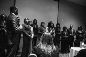A monochrome photograph captures a group of individuals standing in formation, poised and attentive, during a gathering. The mood is one of respect and unity, with dramatic lighting highlighting the speaker in the foreground, while shadows create depth in the audience behind. The composition accentuates the communal atmosphere, emphasizing the connection between the speaker and those listening closely.