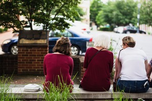 Three women sit together on a stone bench, their backs turned toward the viewer, creating a sense of intimacy and connection. They are dressed in warm tones, harmonizing with the lush greenery that surrounds them, while soft, diffused lighting adds a serene quality to the scene. The backdrop features hints of urban life, blending nature and city in a tranquil moment of companionship.