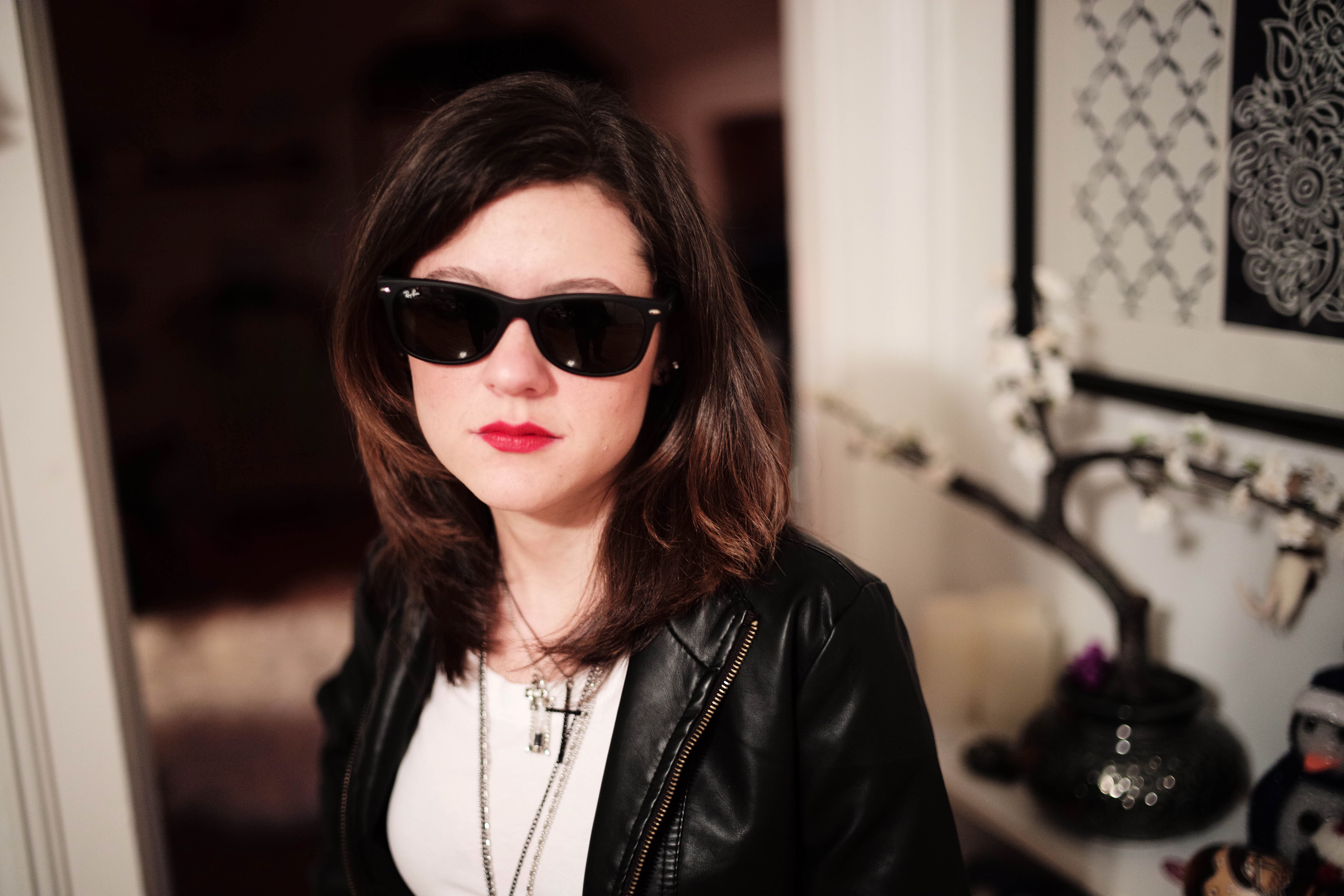 A young woman exudes cool confidence, wearing sunglasses and a leather jacket that enhance her edgy look. The warm, soft lighting highlights her striking red lips against a softly blurred background, creating an intimate yet bold atmosphere. The composition draws the eye directly to her, making her the undeniable focal point of the image.