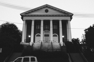 This photograph captures a grand architectural facade, accentuated by the stark contrast of black and white tones. The imposing columns and symmetrical design evoke a sense of solemnity, while the soft glow of streetlights adds a touch of warmth against the encroaching twilight. Shadows and lines converge to create a striking composition, emphasizing the building's grandeur amidst the urban surroundings.