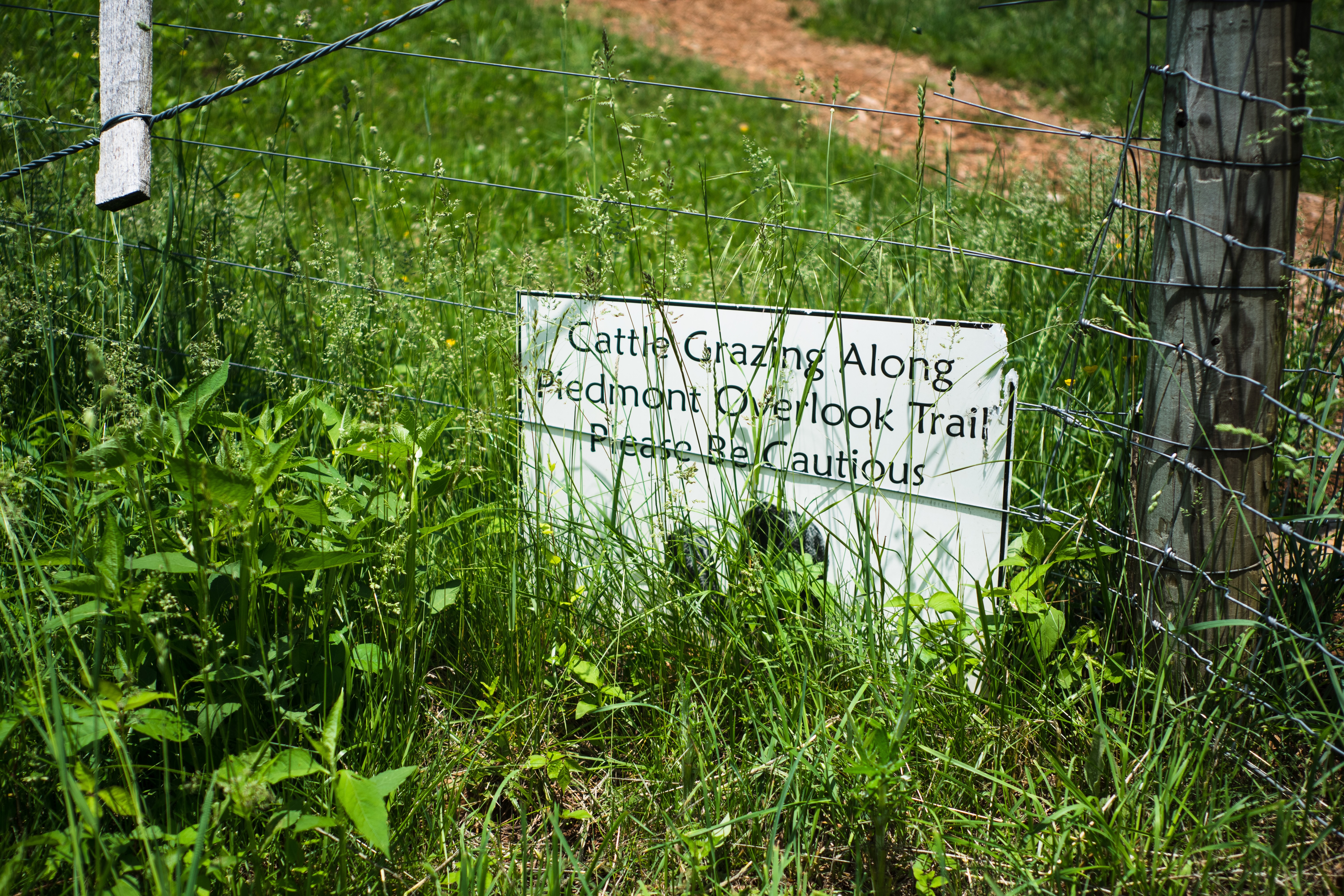 The photo captures a weathered sign amidst lush green foliage, warning hikers of cattle grazing along the Piedmont Overlook Trail. Soft sunlight filters through the grass, creating a tranquil yet cautionary mood in this pastoral setting. The gentle curve of the trail in the background adds depth, inviting viewers to reflect on the harmony between nature and caution.