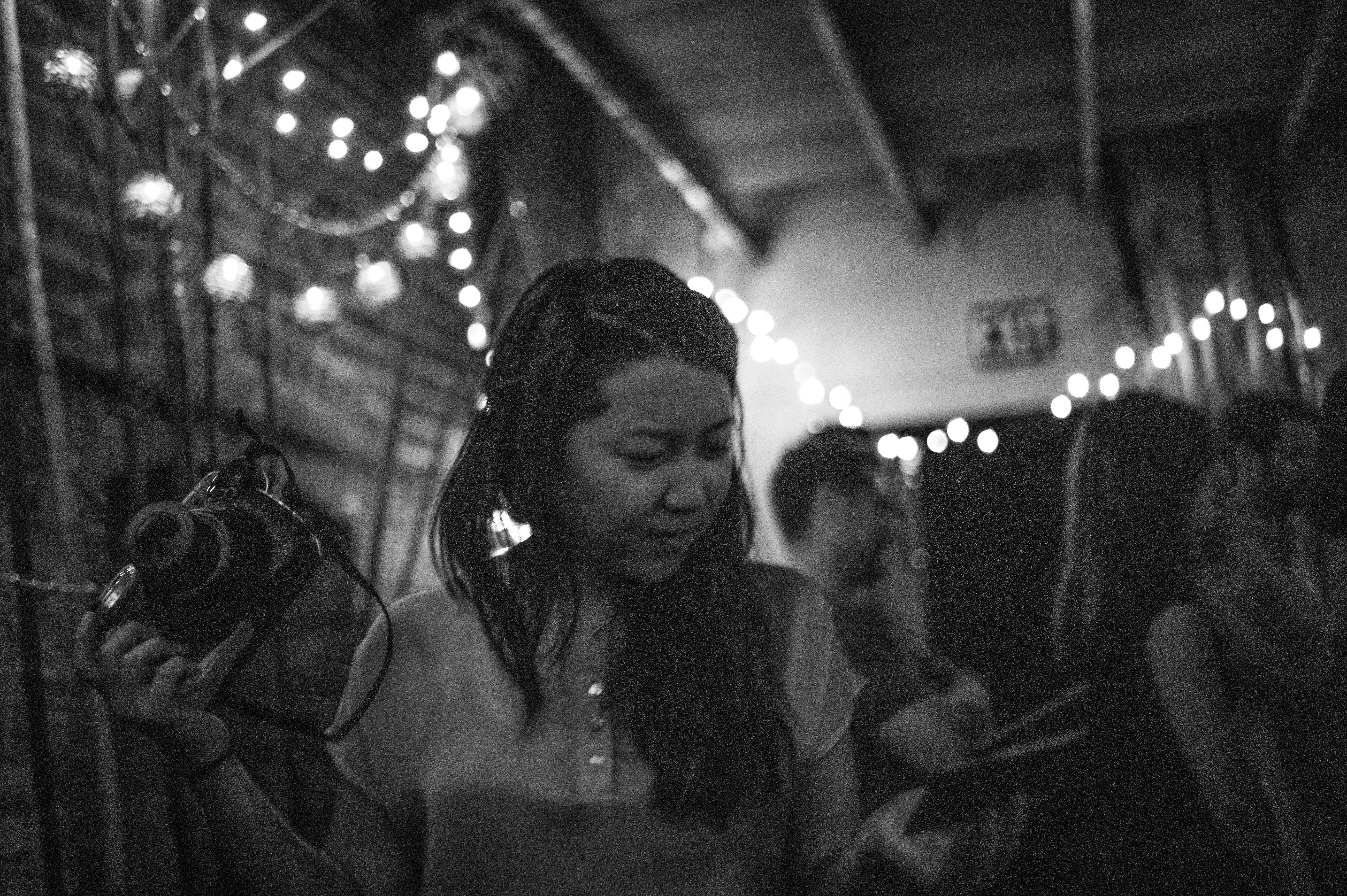 In a dimly lit space adorned with soft string lights, a woman holds a camera and appears deep in thought, perhaps contemplating her next shot. The contrast between the shadows and the warm glow of the lights creates an intimate, reflective mood, suggesting a blend of creativity and nostalgia. Surrounding figures are vaguely visible, adding to the ambiance of a lively gathering without detracting from her focus.