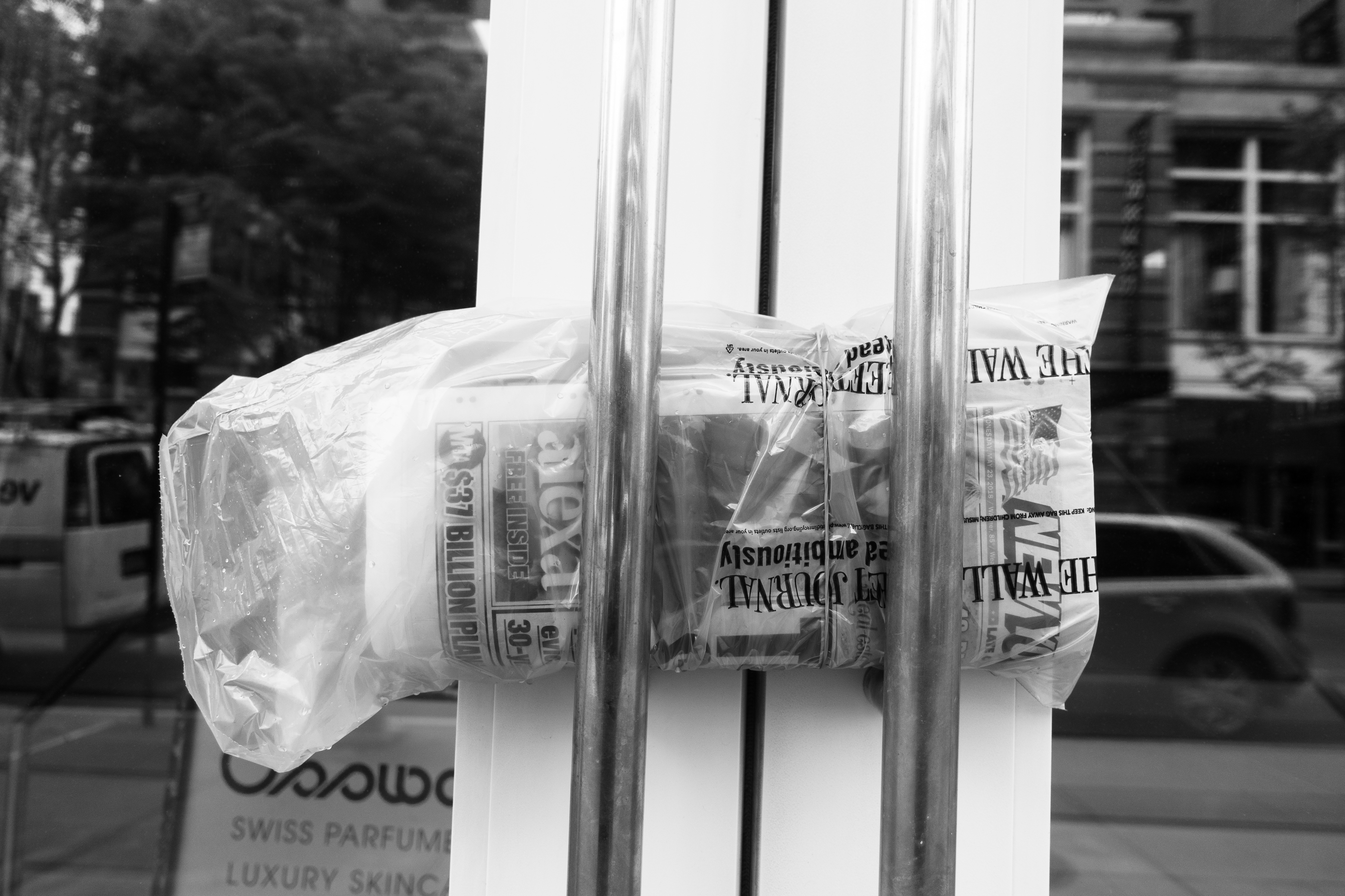 A plastic-wrapped package is secured between two shiny metal bars, creating a stark contrast in this monochrome scene. The composition captures an unexpected interaction between urban elements, evoking a sense of stillness and isolation amidst city life. Soft, diffused lighting accentuates the textures, enhancing the mood of quiet contemplation.