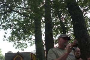 In this photograph, a man with a camera stands partially obscured among towering trees, capturing the serenity of the natural setting. The interplay of soft, dappled sunlight filtering through the leaves creates a peaceful atmosphere, inviting contemplation. The composition balances the human element with the lush greenery, enhancing the mood of tranquil exploration.