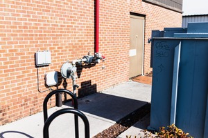 This photograph captures a utilitarian corner of a building, featuring a brick wall, piping, and a metallic container. The bright daylight casts sharp shadows, enhancing the stark and functional mood of the scene. The composition draws attention to the intersection of industrial elements and urban infrastructure, subtly inviting reflections on the often-overlooked aspects of city life.