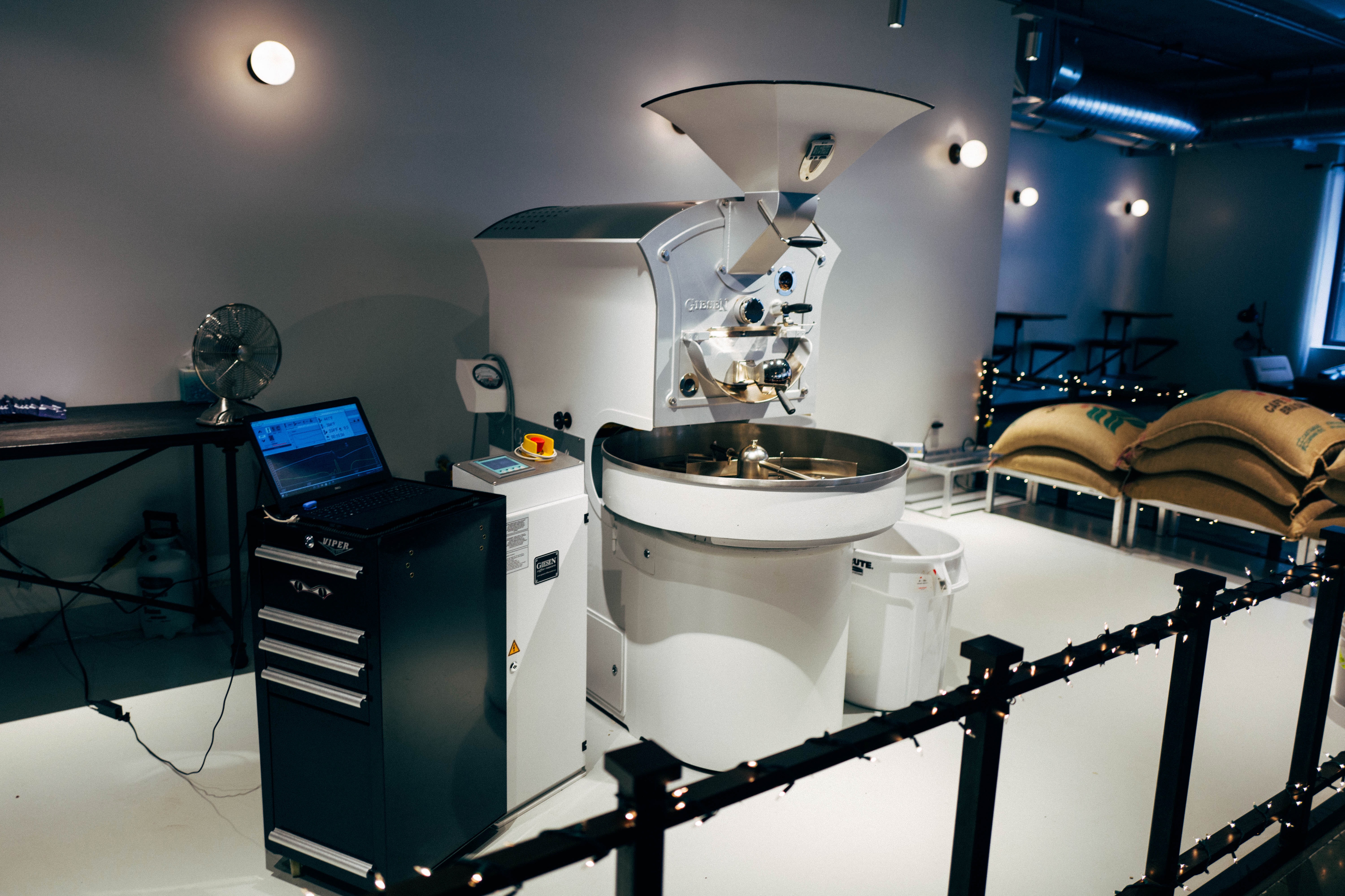 The photograph captures a sleek, modern coffee roasting machine in a bright, minimalistic space, exuding an atmosphere of innovation and craftsmanship. Soft, ambient lighting highlights the machine’s polished surfaces, while sacks of coffee beans suggest the promise of rich flavors yet to come. The composition balances technology and artistry, inviting viewers into the world of coffee production with a sense of warmth and anticipation.