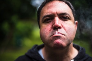 The photograph captures a man with a contemplative expression, smoke curling from his mouth as he stares directly at the camera. The muted lighting creates a somber mood, accentuating the intensity of his gaze, while the blurred background hints at an outdoor setting, adding depth to the composition.