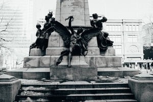 The photograph captures a striking monochromatic view of a grand monument, featuring intricate sculptures that evoke a sense of solemnity and reflection. The compositions highlight the dramatic winged figure at the base, surrounded by other figures, all rendered in captivating detail against a muted urban backdrop. The stark lighting enhances the textures of the stone and metal, creating a powerful contrast that amplifies the monument's gravitas.