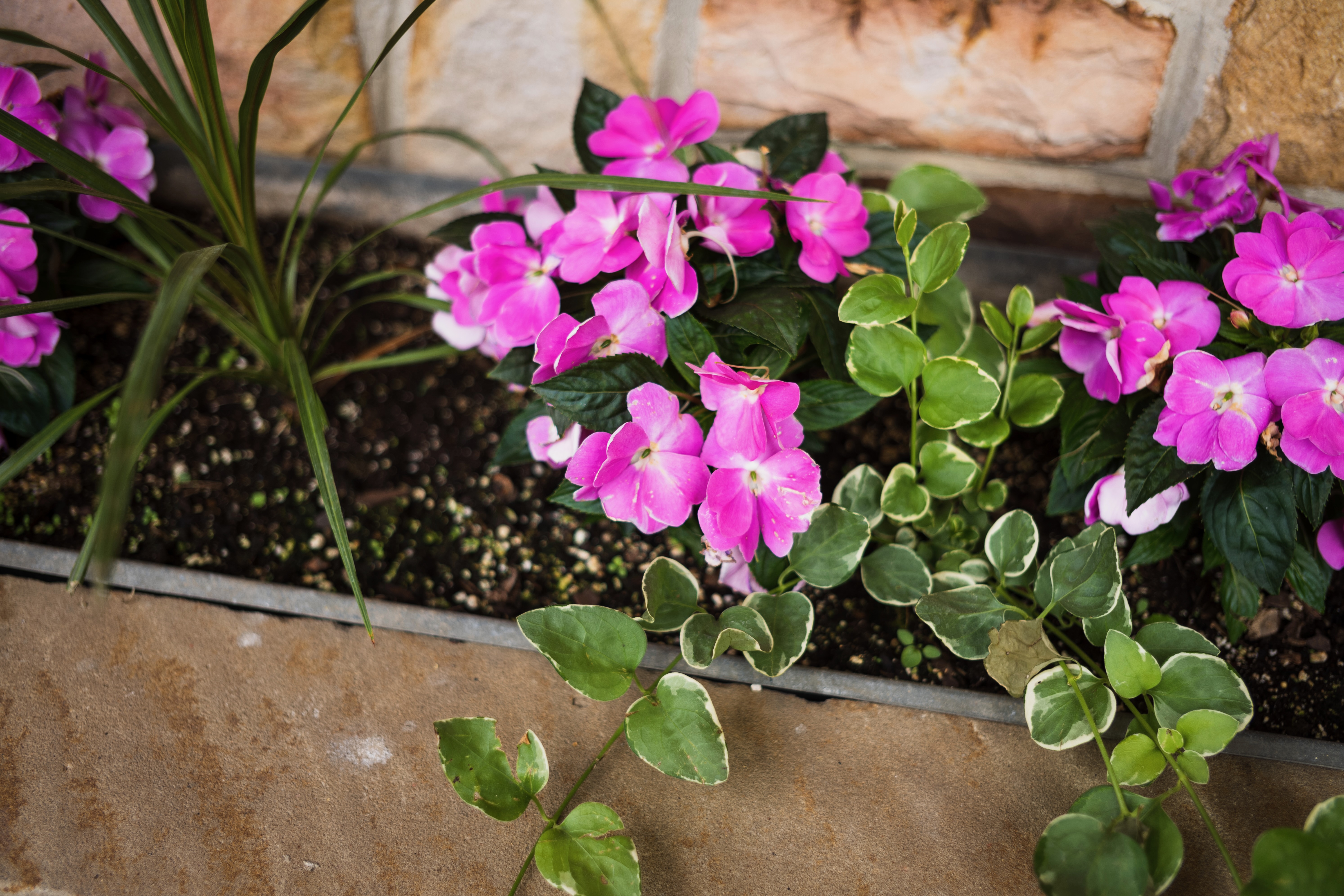 This photograph captures a vibrant arrangement of pink flowers nestled in rich soil, complemented by green foliage. The soft, natural lighting enhances the vivid colors, creating a cheerful and inviting atmosphere. The composition, with the flowers strategically placed against a textured stone background, draws the viewer’s eye toward the lush details of nature.