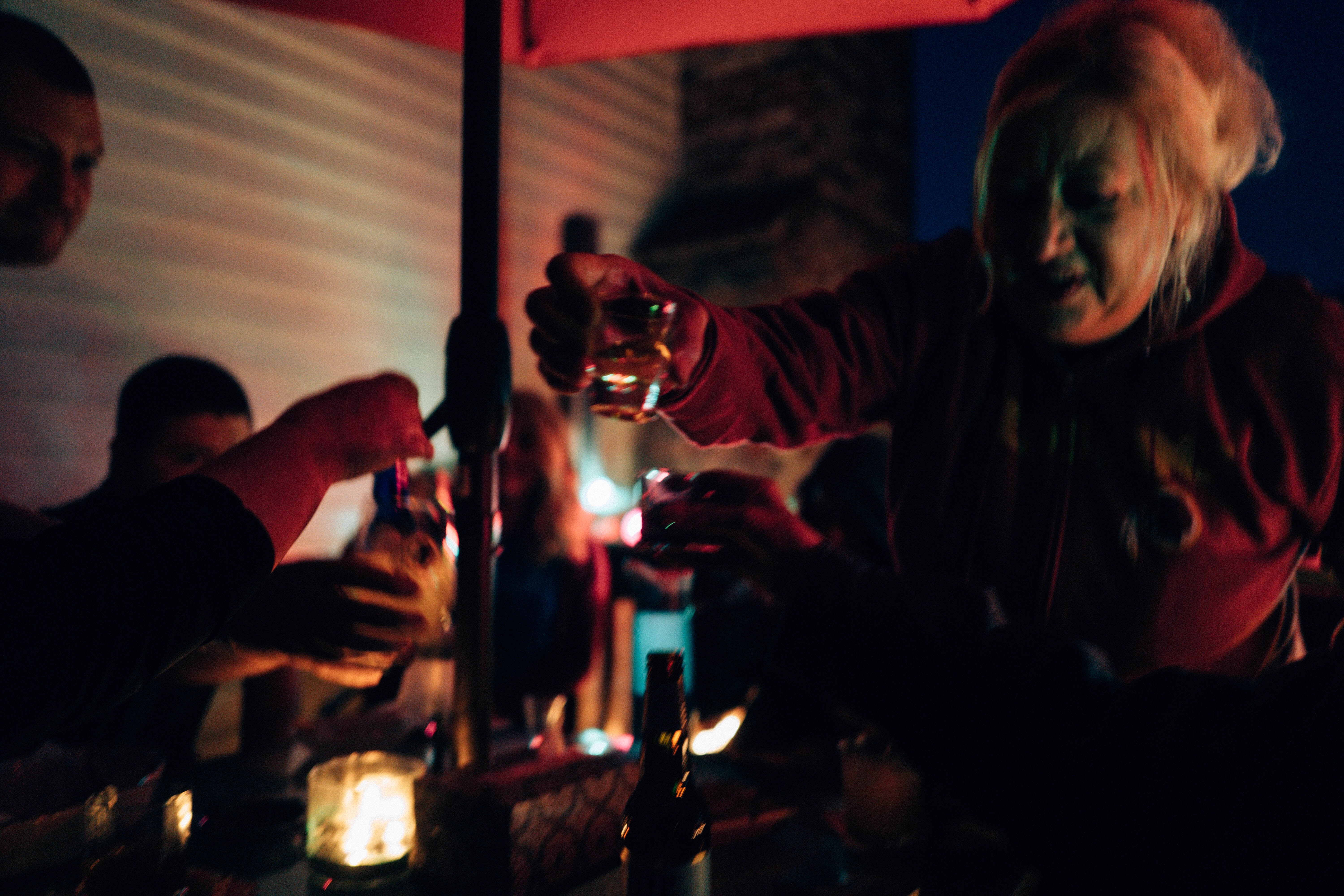 In a warmly lit outdoor setting, a group of friends engages in a lively toast, their faces illuminated by the soft glow of candlelight and colored ambient lighting. The composition highlights the joyful interactions, with hands reaching out to share drinks against a backdrop that feels intimate and celebratory. The mood is vibrant and carefree, capturing a moment of connection and revelry under the night sky.