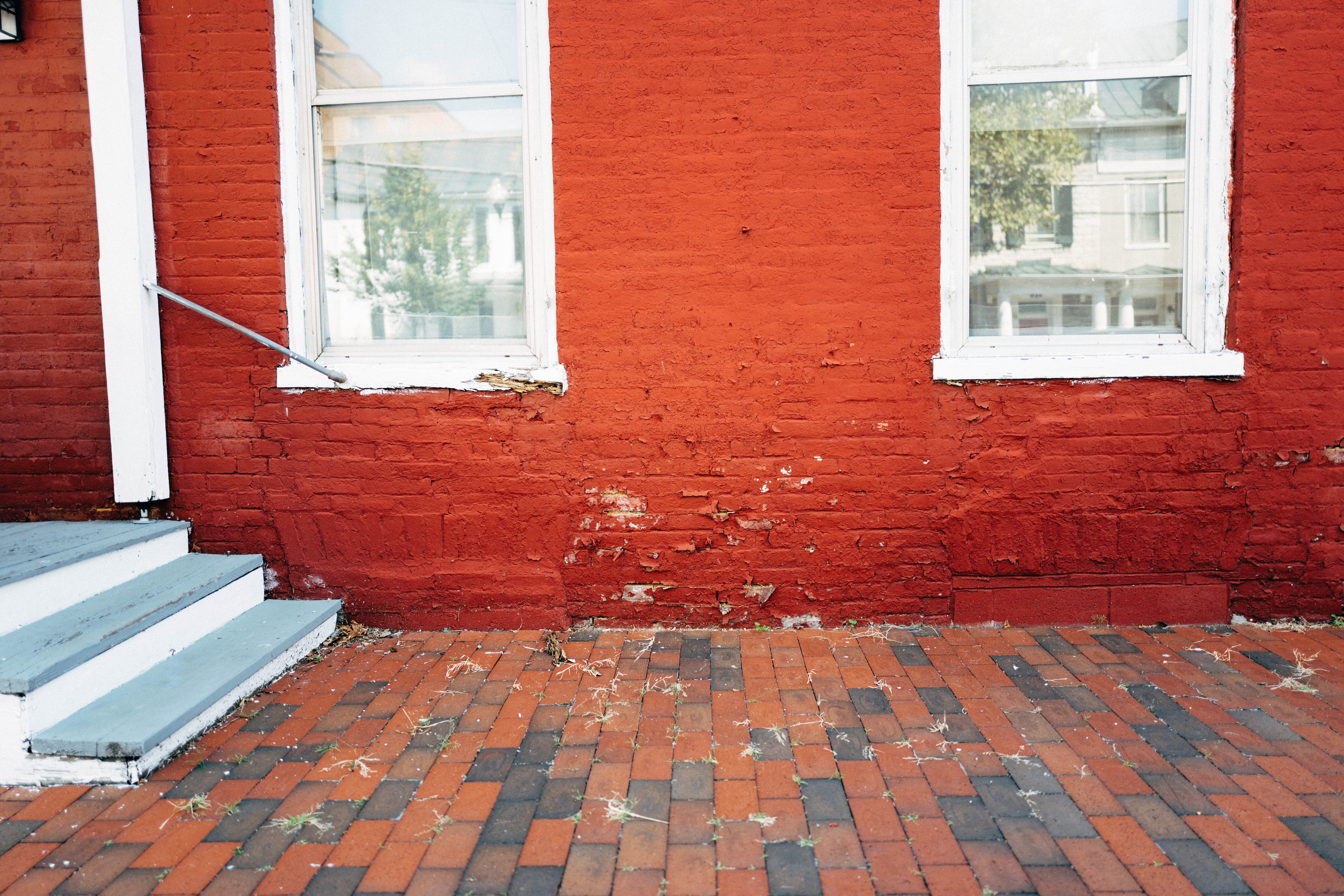 A vibrant red brick wall anchors the composition, juxtaposed with the subtle texture of worn, multicolored pavement. The sunlight softly illuminates the scene, casting gentle shadows and enhancing the wall's weathered imperfections. This urban tableau evokes a sense of stillness and nostalgia, inviting viewers to reflect on the layers of time and place.