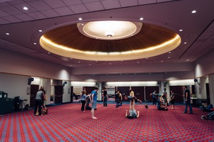 In a large, open room filled with vibrant carpet patterns and soft overhead lighting, a diverse group of individuals engages in various forms of movement. The airy composition invites a sense of camaraderie and creativity, while the central chandelier draws the eye upward, accentuating the height and spaciousness of the environment.