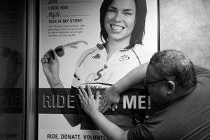 In this striking black-and-white image, a man adjusts a vibrant, larger-than-life poster of a smiling woman, reinforcing a sense of personal connection to her story as a cancer survivor. The composition balances the dynamic interaction between the subject and the poster, highlighting themes of resilience and community support. Soft lighting enhances the emotional weight, drawing attention to the characters' expressions and the powerful message of hope and determination.