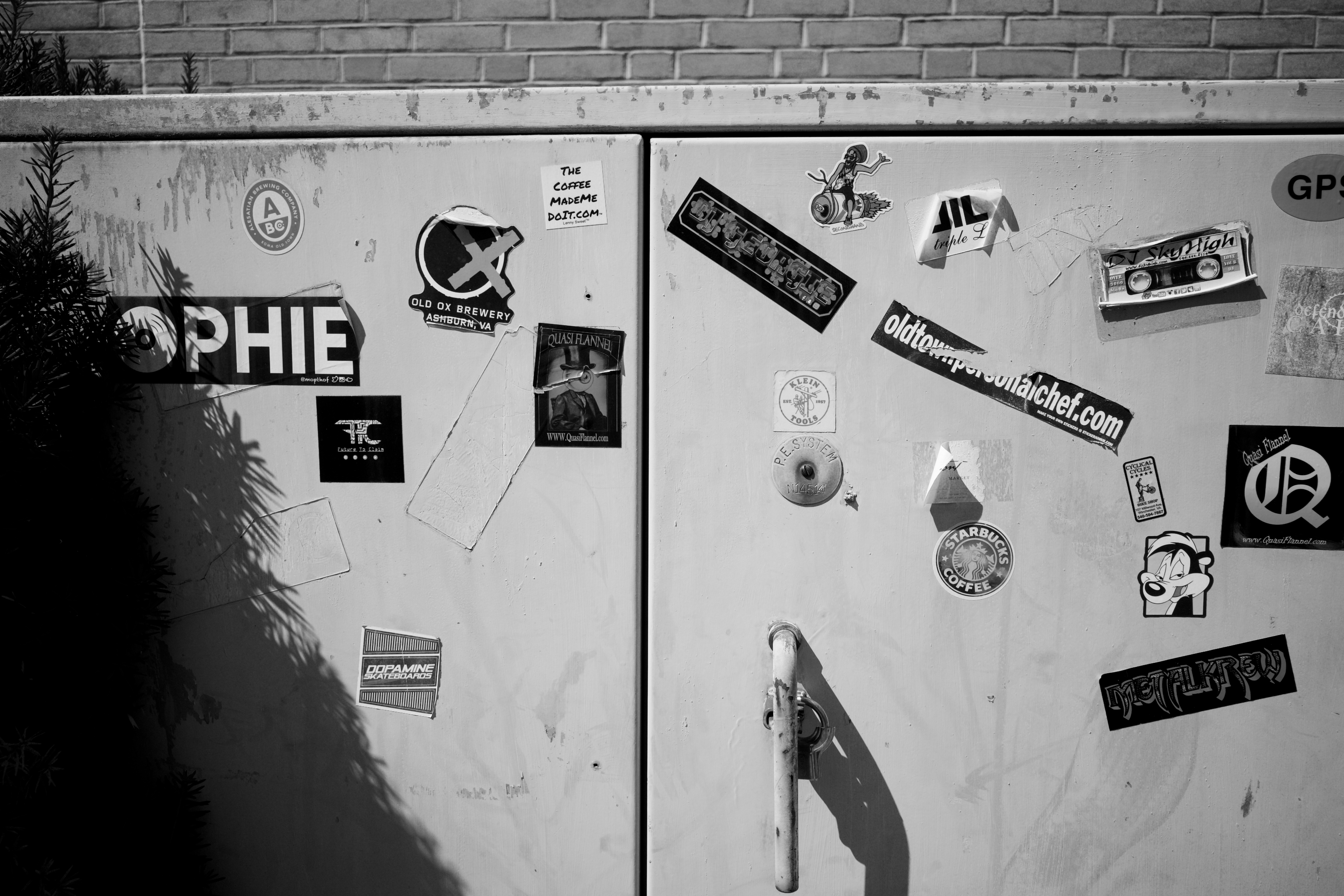 The photograph captures a weathered utility box adorned with a collage of eclectic stickers, showcasing a blend of personal expression and urban culture. The monochromatic palette enhances the gritty mood, drawing attention to the textures and layers of the stickers, while soft natural light casts subtle shadows, creating depth and intrigue. This juxtaposition of colors and designs tells a silent story of individuality amidst the mundanity of city life.