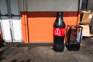 A large black bottle-shaped container stands prominently against a vibrant orange wall, casting a strong shadow on the pavement. To its right, an empty glass case leans against cardboard boxes, hinting at a story of abandonment. The bright sunlight enhances the contrasting colors and highlights the textures, creating an atmosphere of urban intrigue and stillness.