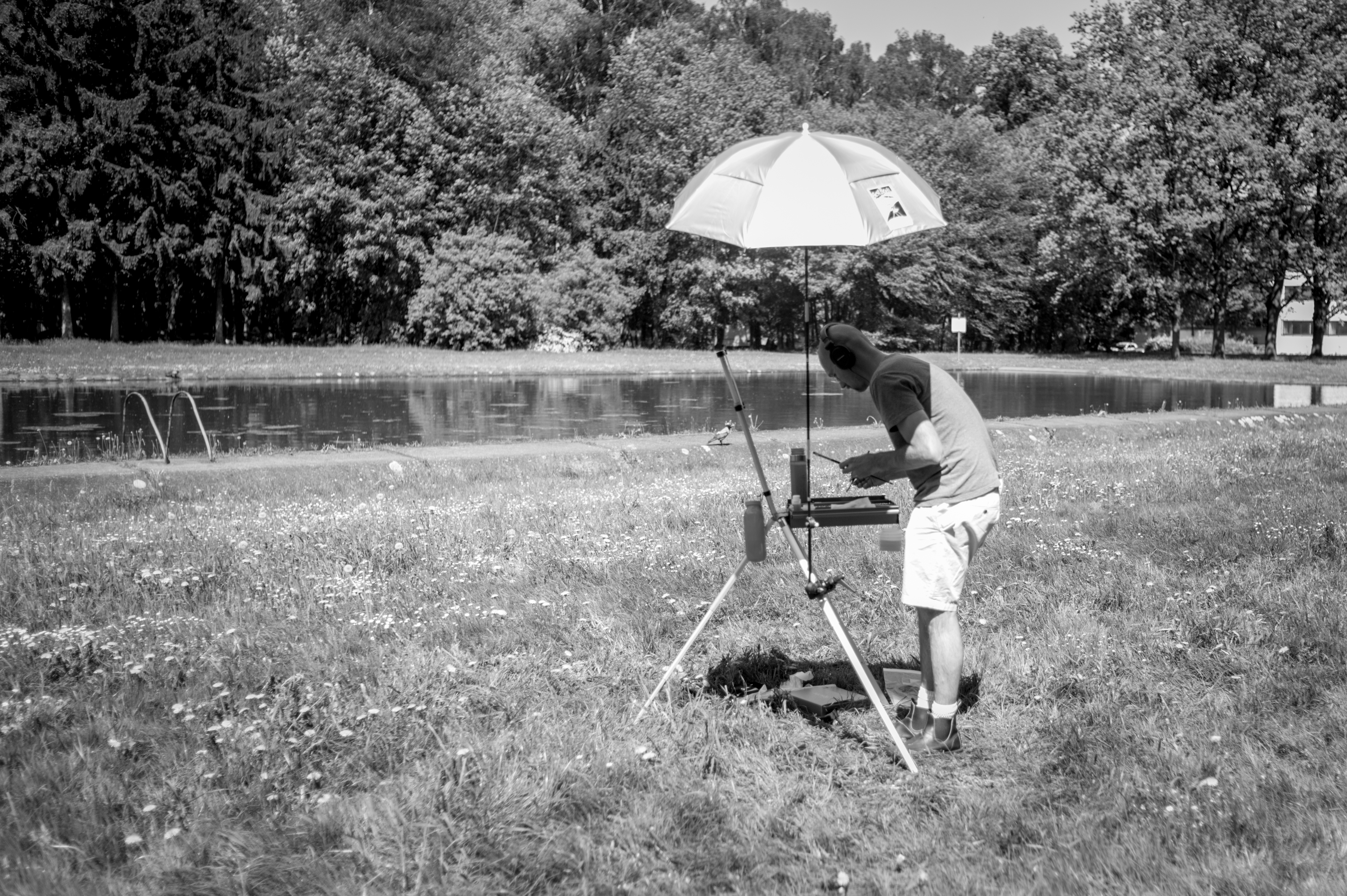 In this black-and-white photograph, a solitary figure stands under a large umbrella, focused intently on an easel beside a tranquil pond. The soft light filters through the surrounding trees, lending a serene ambiance to the scene, while the relaxed posture of the person conveys an air of deep concentration. The composition captures a moment of peaceful creativity amidst nature's calm, emphasizing the juxtaposition of man-made art against the backdrop of the lush landscape.