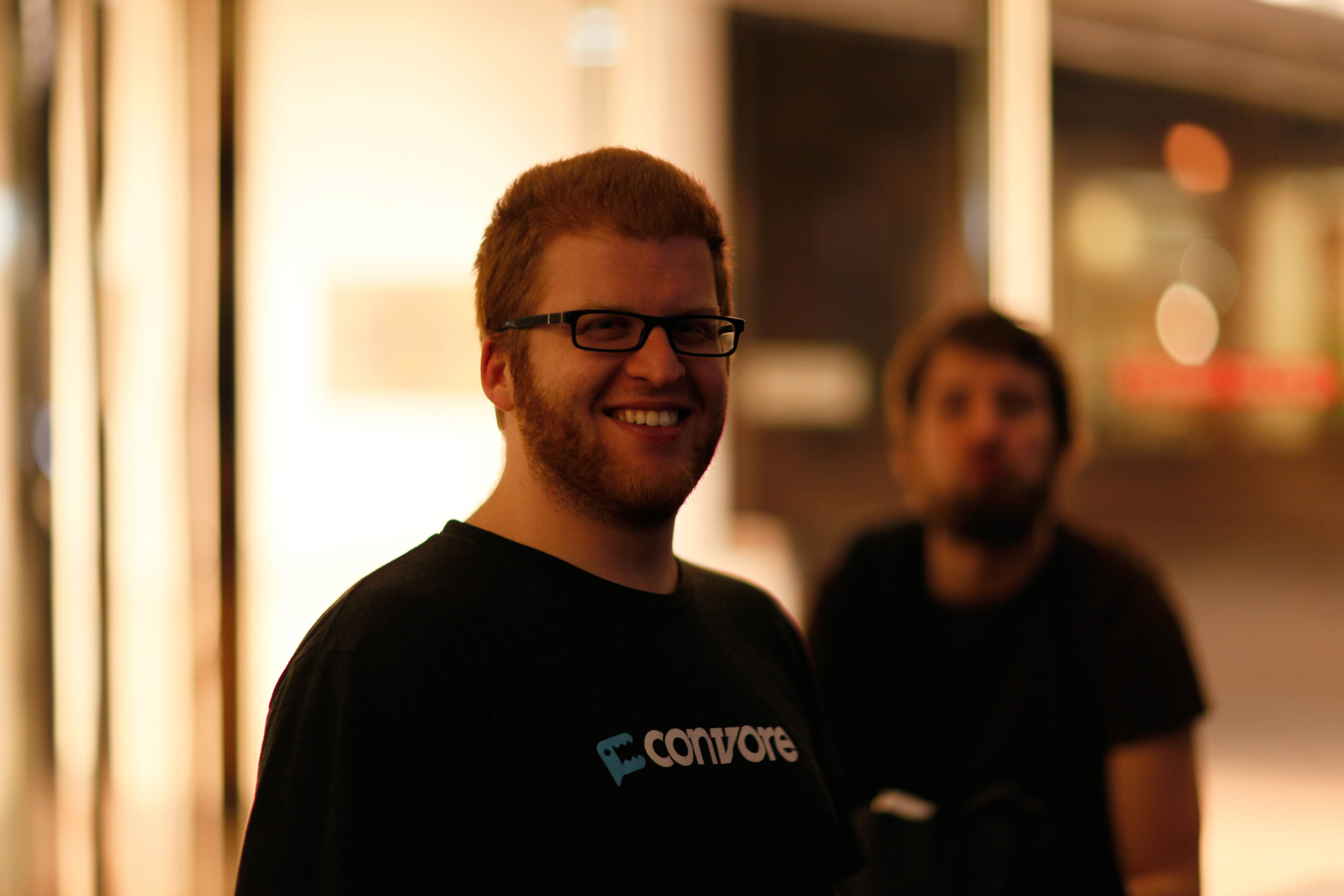 In this warm, blurred nightlife portrait, a young man flashes a friendly grin, exuding a carefree and joyous spirit. The soft lighting creates a cozy atmosphere as subtle bokeh hints at the bustling surroundings, while a shadowy figure looms in the background, adding depth to the scene. The composition emphasizes the subject's playful energy, inviting viewers into a moment of genuine connection.