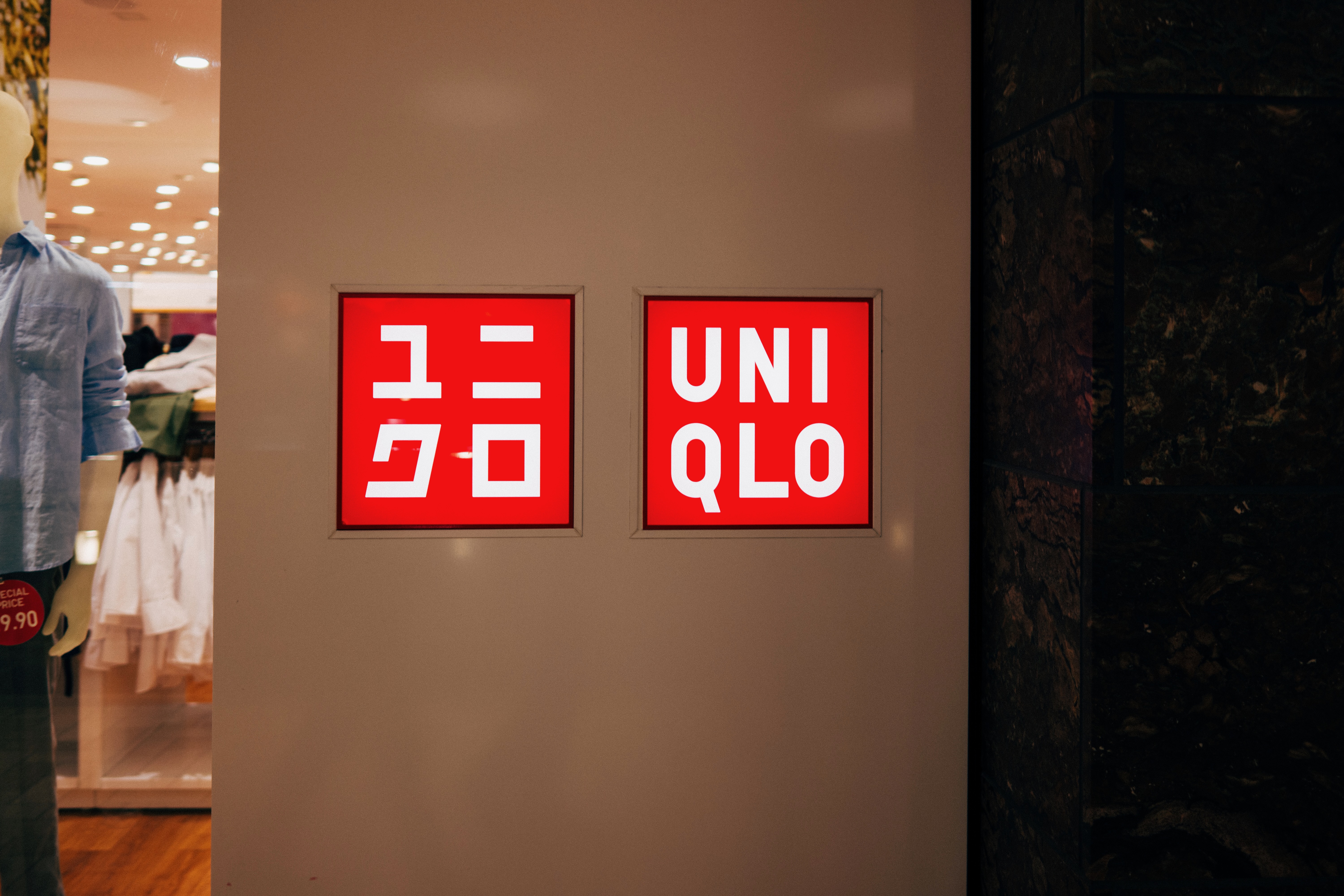 The photograph features the vibrant red signage of the UNIQLO store, showcasing both English and Japanese characters in a neat, modern composition. Soft, warm lighting creates an inviting atmosphere, while the presence of a mannequin hints at the store's retail environment. This visual representation captures the essence of contemporary fashion retail, emphasizing clarity and accessibility.