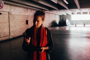A woman stands contemplatively in a shadowy parking garage, illuminated by soft, diffused light from an exit. Her striking red scarf contrasts against her dark attire, adding warmth to the cool, industrial environment. The composition emphasizes solitude and introspection, capturing a moment of quiet amidst the urban backdrop.
