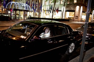 In a dimly lit urban setting, a man clad in formal attire slumbers inside a sleek black car, his serene expression contrasting with the bustling world outside. The soft glow of city lights envelops the scene, while a backdrop of vibrant flags adds a pop of color, emphasizing the stillness amid the nighttime energy. This juxtaposition evokes a sense of both isolation and the quiet moments found within a vibrant city life.