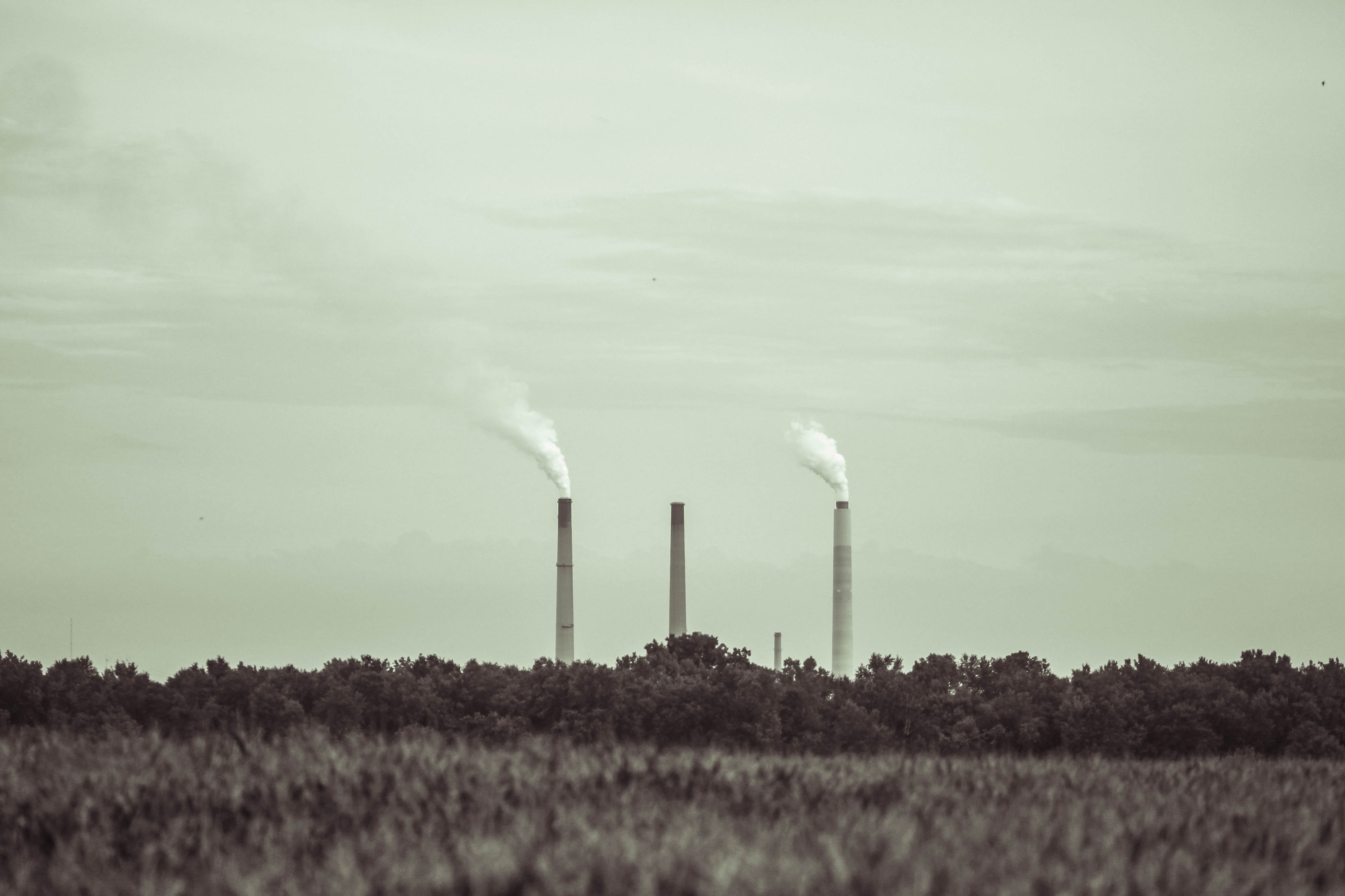 This photograph captures three industrial smokestacks rising above a muted landscape, their white plumes softly contrasting against an overcast sky. The desaturated tones evoke a somber mood, reflecting the environmental impact of industry on nature. The composition enhances the feeling of isolation, as the towering structures dominate the skyline, looming over the horizon like guardians of a forgotten era.