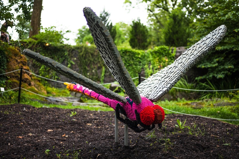 This vibrant sculpture of a dragonfly, crafted from colorful Lego bricks, stands majestically amidst a lush garden backdrop. The bright pink and gray hues contrast beautifully with the natural greenery, evoking a sense of playful creativity. Soft, dappled lighting enhances the intricate details of the structure, creating an enchanting atmosphere that draws the viewer into a world of imagination.