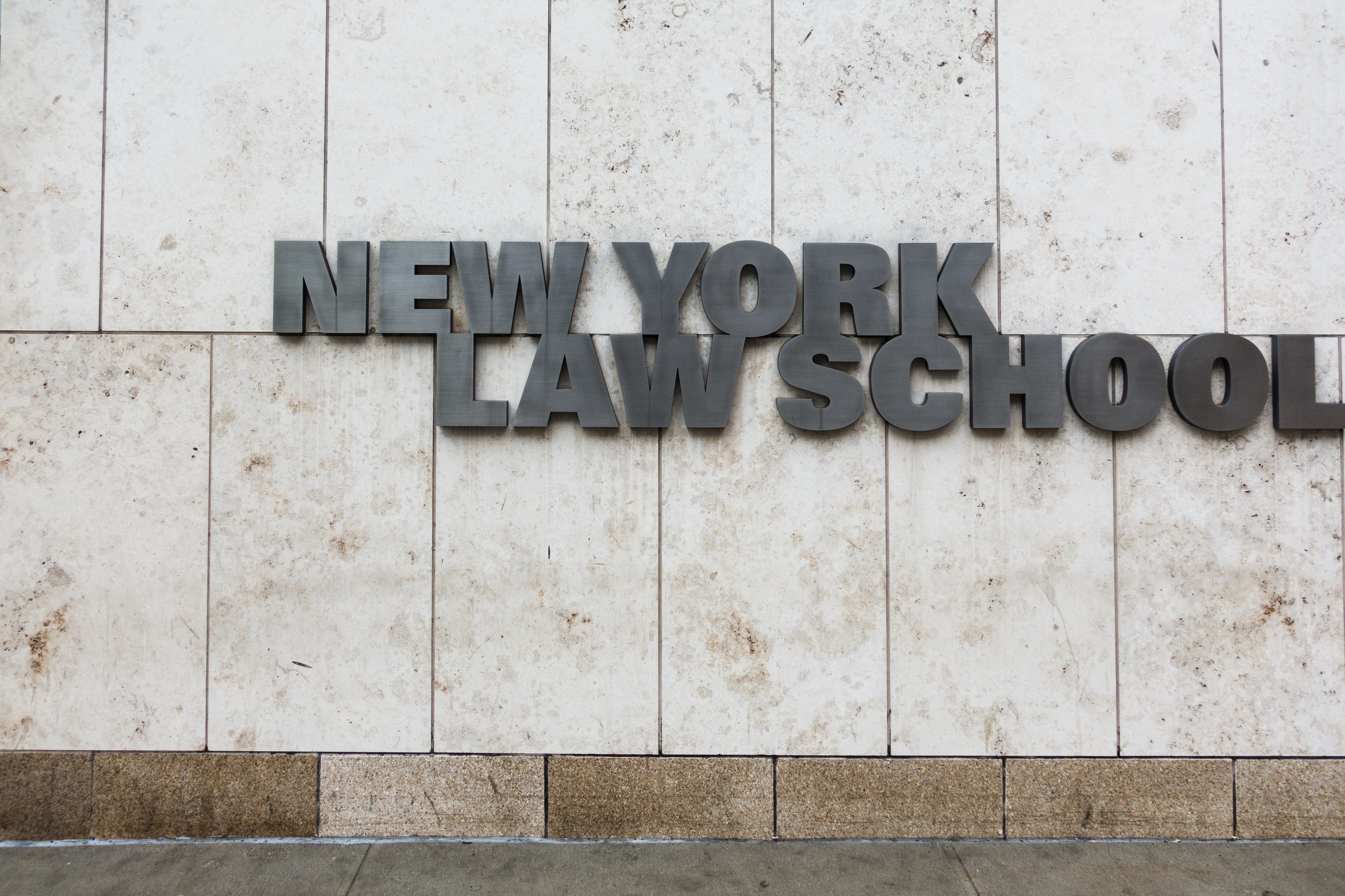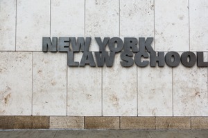 The photograph features the bold sign of New York Law School, prominently displayed against a clean, textured stone wall. The muted tones create a solemn yet modern atmosphere, emphasizing the gravitas of education and law. The composition is minimalistic, drawing the viewer's focus to the strong typography and the architectural elements that frame the scene.