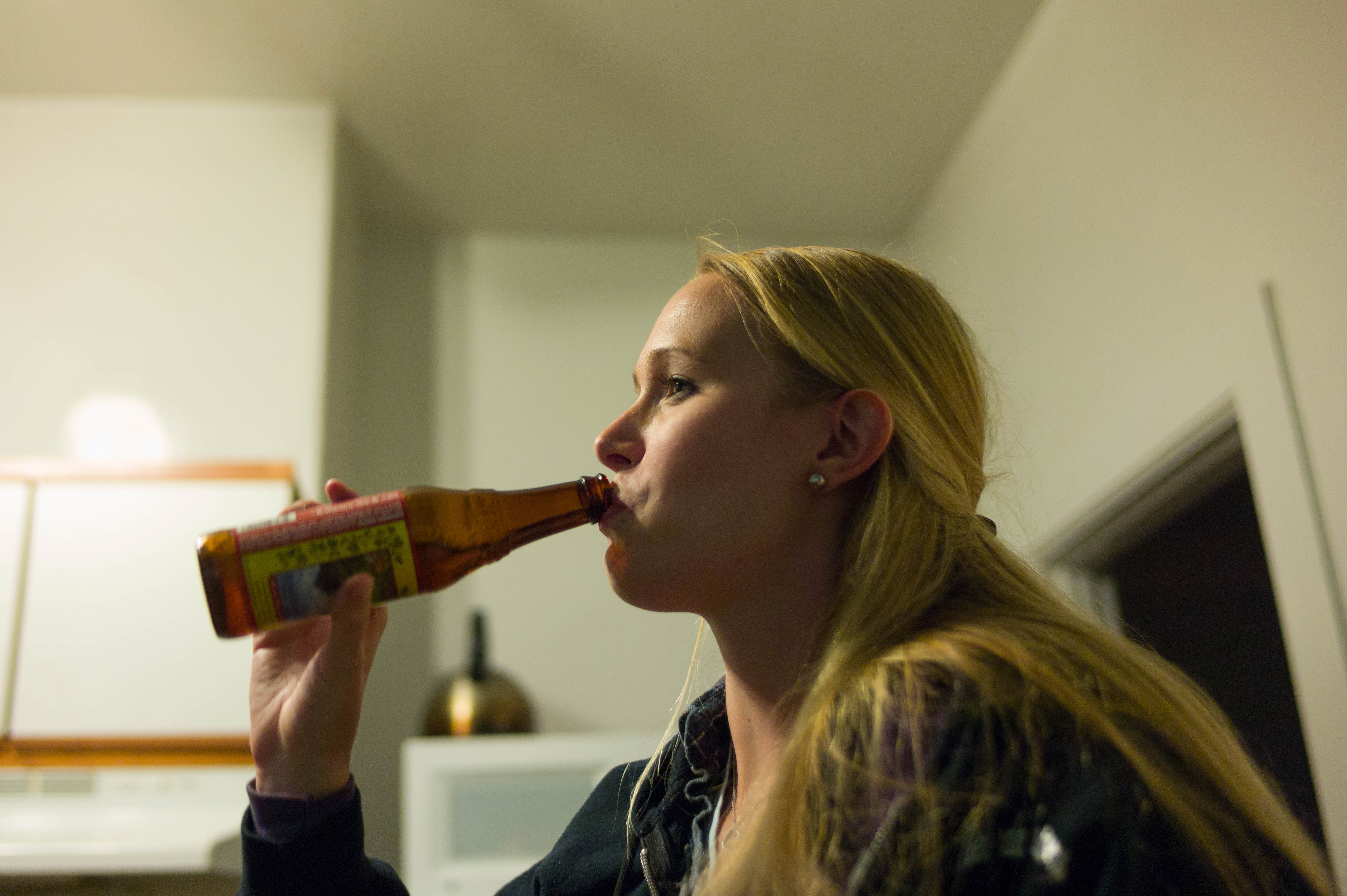 The photograph captures a woman in profile, savoring a drink, with her long, blonde hair softly illuminated by warm kitchen light. The composition highlights her contemplative expression, set against a softly blurred background that suggests an intimate and relaxed atmosphere. The muted colors and soft focus contribute to a sense of calm and introspection, evoking a moment of pause in a lively setting.