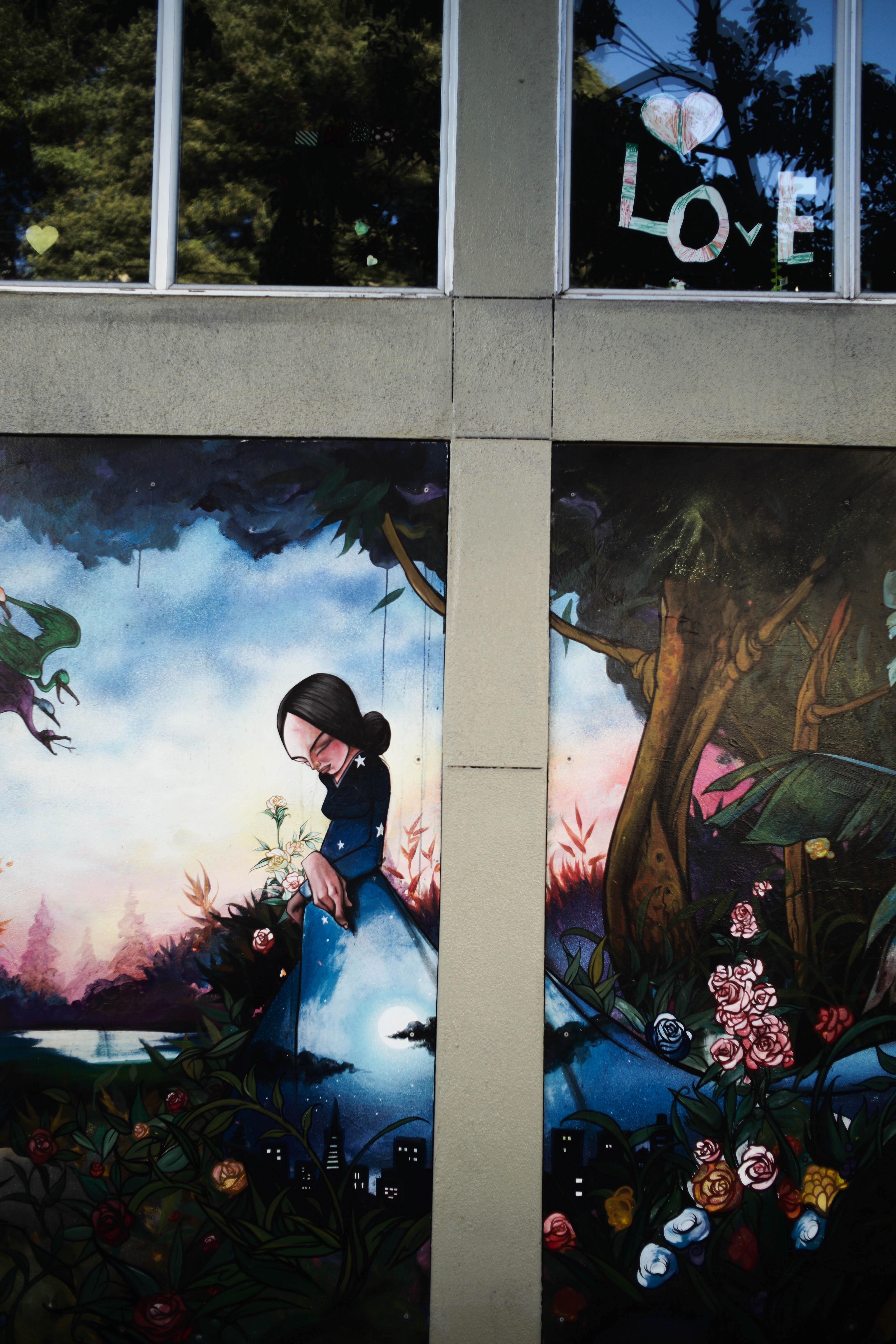 This vibrant mural captures a young girl seated amidst a lush, whimsical landscape, evoking a sense of contemplation and tranquility. The interplay of colors—from deep blues to soft pinks—creates a dreamlike atmosphere, while the delicate floral details and a backdrop of urban silhouettes add layers of depth to the scene. Sunlight filtering through nearby trees enhances the artwork's enchanting mood, inviting viewers to pause and reflect.