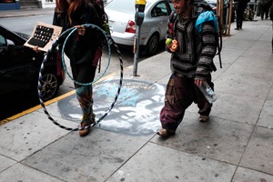 Two individuals stroll along a textured sidewalk, showcasing a lively urban atmosphere. The woman holds colorful hula hoops and a display board, while the man, dressed in vibrant, bohemian attire, clutches apples and a water bottle, embodying a carefree spirit. The muted lighting casts a soft glow on the scene, highlighting the graffiti beneath their feet, which adds a layer of artistic expression to the moment.