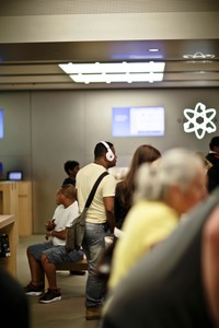 In a bustling tech store, individuals navigate the modern environment, with a man in headphones capturing a moment of solitude amidst the crowd. The warm lighting creates an inviting atmosphere, while the soft focus adds a dreamlike quality, emphasizing the blend of engagement and isolation. The composition showcases a variety of patrons, each absorbed in their own world, highlighting the juxtaposition of connection and individuality in a digital age.