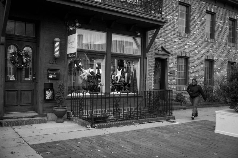 This black and white photograph captures a quaint storefront adorned with festive decorations, contrasting with the simple brick architecture. A solitary figure walks past, adding a sense of solitude and introspection to the scene, while soft natural light enhances the nostalgic atmosphere. The composition balances architectural elements with the human presence, creating a serene moment in an urban setting.