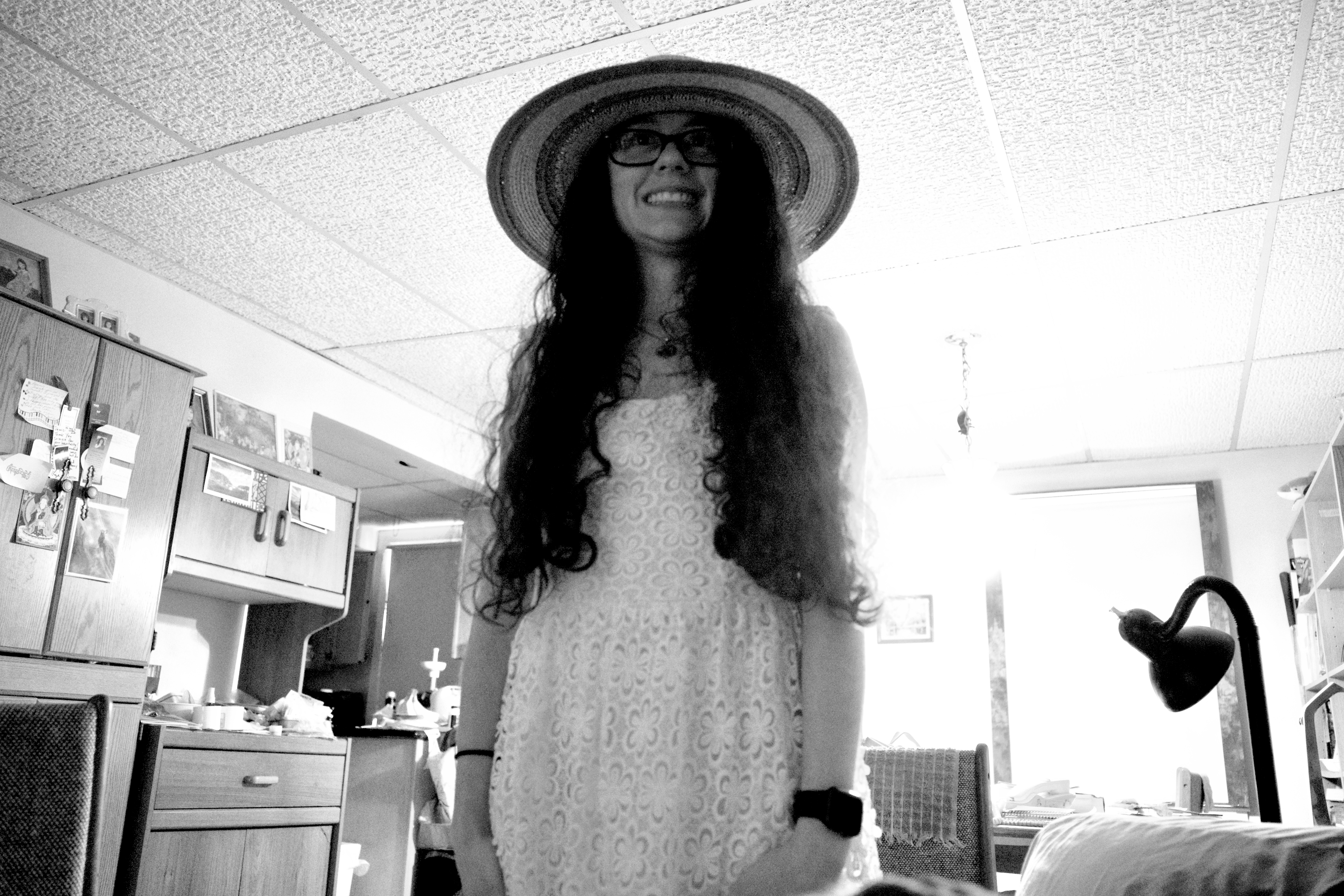 A cheerful figure stands in a softly lit room, adorned in a white, lace dress and a wide-brimmed hat, exuding a sense of carefree joy. The contrasting black and white tones enhance the atmospheric simplicity, with playful shadows dancing across the walls. The cozy clutter of the room surrounds her, creating an intimate snapshot of everyday life.