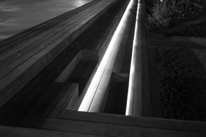 This photograph captures a striking composition of wooden planks arranged parallel, illuminated by a soft, linear glow beneath them. The stark contrast of black and white enhances the mood, evoking a sense of calm and intrigue as the light draws the eye along the structure. The shadows play elegantly around the edges, adding depth and dimension to the scene.